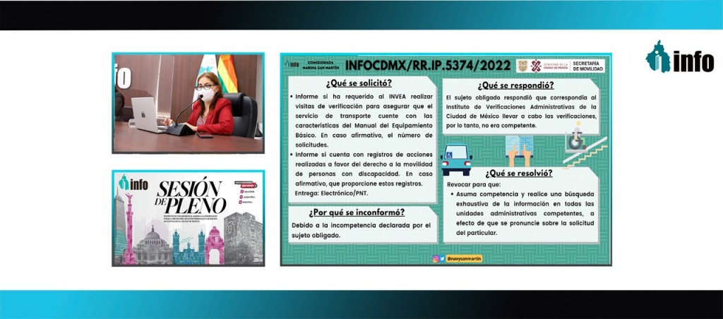 Durante la 42 sesión ordinaria del pleno del Info, la comisionada Marina San Martín Rebolloso expuso el recurso INFOCDMX/RR.IP.5374/2022, donde una persona requirió saber si la Semovi ha requerido al Invea verificar el transporte, para asegurar que cuente con las características del Manual del Equipamiento Básico.