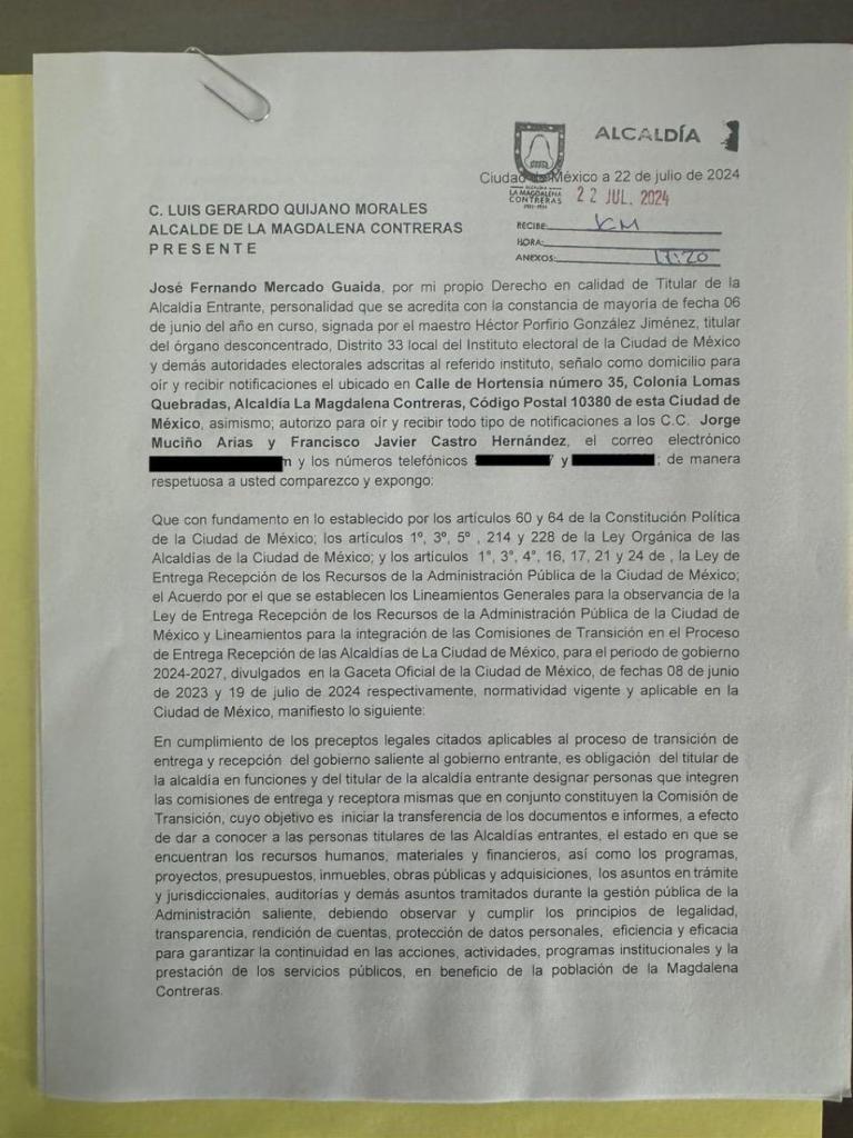 El alcalde electo de Magdalena Contreras, Fernando Mercado Guaida, anunció que solicitó al todavía titular de esa demarcación, Luis Gerardo Quijano, iniciar con el proceso de entrega-recepción, que tiene como objetivo desarrollar los trabajos de cambio de administración.