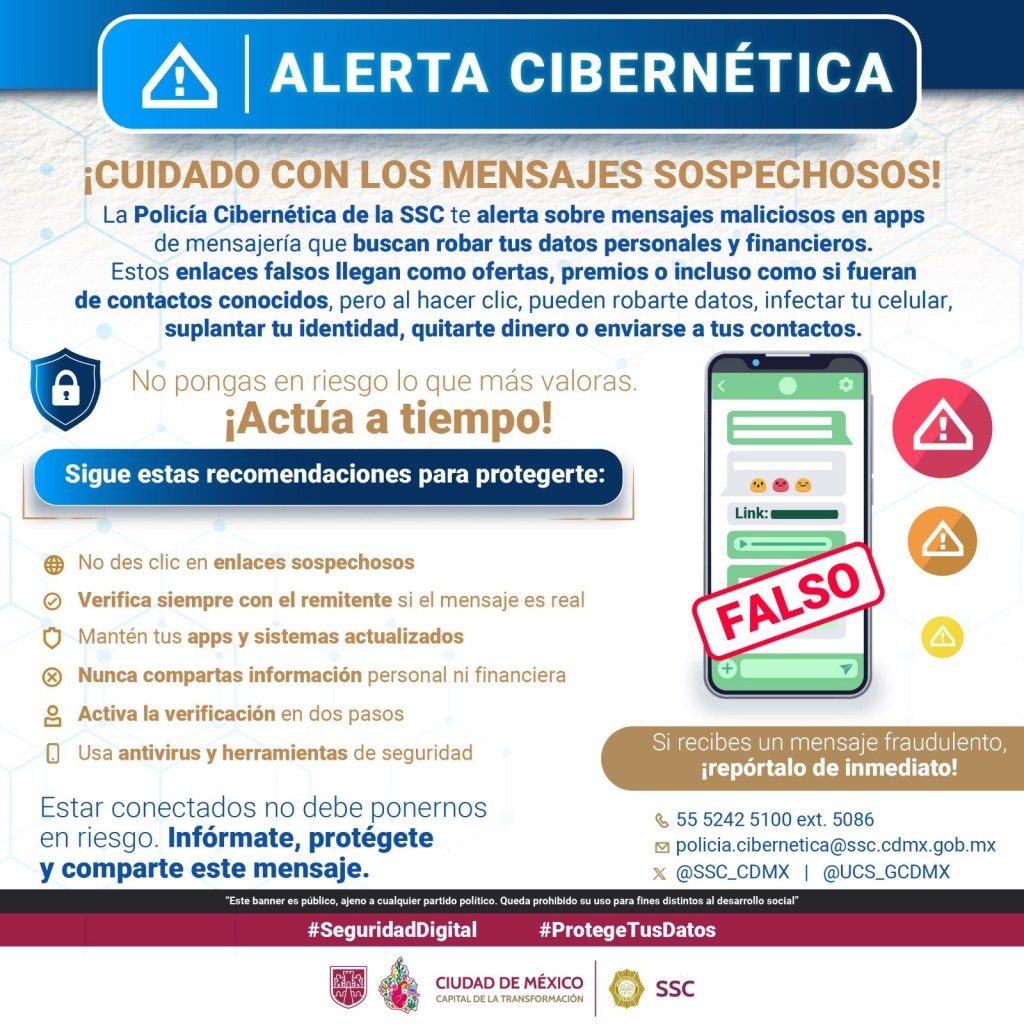 Empero, si recibes un mensaje sospechoso, repórtalo de inmediato a la Unidad de Policía Cibernética, llamando al 55 5242 5100, ext. 5086, enviando un correo a policia.cibernetica@ssc.cdmx.gob.mx o en las cuentas oficiales @SSC_GCDMX y @UCS_GCDMX.