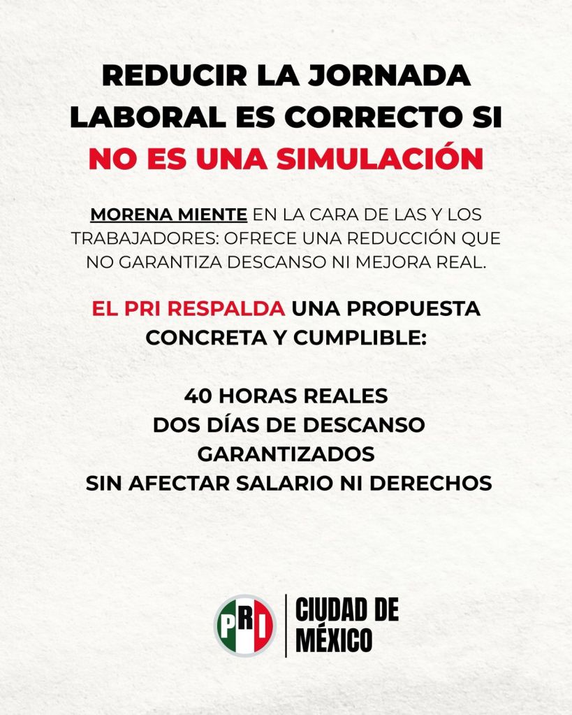 La propuesta del PRI es clara: 40 horas efectivas, en cinco días de trabajo y dos de descanso; sí a la reducción de jornada, no a una reforma que vende “40”, pero deja la realidad igual o peor.